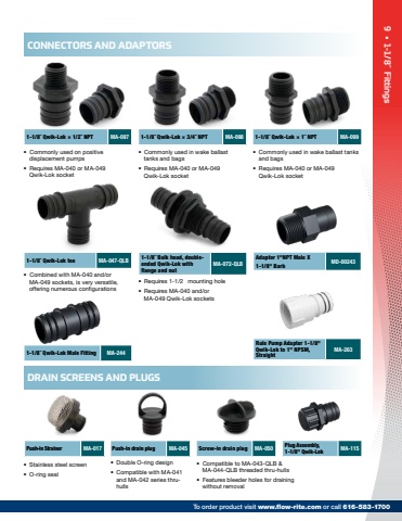 %u2022 Requires 1-1/2 mounting hole%u2022 Requires MA-040 and/or MA-049 Qwik-Lok sockets%u2022 Combined with MA-040 and/or MA-049 sockets, is very versatile, offering numerous configurations1-1/8%u02dd Qwik-Lok tee MA-047-QLB Adaptor 1\1-1/8\MD-00243Rule Pump Adaptor 1-1/8\Qwik-Lok to 1\StraightMA-2631-1/8%u02dd Bulk head, doubleended Qwik-Lok with flange and nutMA-072-QLB%u2022 Commonly used on positive displacement pumps%u2022 Requires MA-040 or MA-049 Qwik-Lok socket%u2022 Commonly used in wake ballast tanks and bags%u2022 Requires MA-040 or MA-049 Qwik-Lok socket%u2022 Commonly used in wake ballast tanks and bags%u2022 Requires MA-040 or MA-049 Qwik-Lok socket1-1/8%u02dd Qwik-Lok %u00d7 1/2%u02dd NPT MA-097 1-1/8%u02dd Qwik-Lok %u00d7 3/4%u02dd NPT MA-098 1-1/8%u02dd Qwik-Lok %u00d7 1%u02dd NPT MA-099CONNECTORS AND ADAPTORS1-1/8%u02dd Qwik-Lok Male Fitting MA-244%u2022 Double O-ring design%u2022 Compatible with MA-041 and MA-042 series thruhulls%u2022 Stainless steel screen%u2022 O-ring seal%u2022 Compatible to MA-043-QLB &MA-044-QLB threaded thru-hulls%u2022 Features bleeder holes for draining without removalDRAIN SCREENS AND PLUGSPush-in Strainer MA-017 Screw-in drain plug MA-050 Plug Assembly, 1-1/8\Push-in drain plug MA-045 MA-1159 %u2022 1-1/8%u02dd FittingsTo order product visit www.flow-rite.com or call 616-583-1700