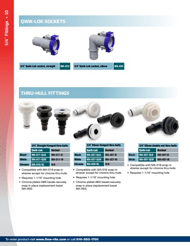 10QWIK-LOK SOCKETS3/4%u02dd Qwik-Lok socket, straight MA-014 3/4%u02dd Qwik-Lok socket, elbow MA-025THRU-HULL FITTINGS%u2022 Compatible with MA-018 snap-in strainer except for chrome thru-hulls%u2022 Requires 1-1/16%u02dd mounting hole%u2022 Chrome plated ABS bezels securely snap in place (replacement bezel MA-065)%u2022 Compatible with MA-018 snap-in strainer except for chrome thru-hulls%u2022 Requires 1-1/16%u02dd mounting hole3/4%u02dd Elbow flanged thru-hullsQwik-Lok BarbedBlack MA-027-QLB MA-027-BWhite MA-027-QLW MA-027-WChrome MA-028-QL N/A%u2022 Compatible with MA-018 snap-in strainer except for chrome thru-hulls%u2022 Requires 1-1/16%u02dd mounting hole%u2022 Chrome plated ABS bezels securely snap in place (replacement bezel MA-065)3/4%u02dd Straight flanged thru-hullsQwik-Lok BarbedBlack MA-011-QLB MA-011-BWhite MA-011-QLW MA-011-WChrome MA-016-QL N/A3/4%u02dd Elbow double nut thru-hullsQwik-Lok BarbedBlack MA-007-QLB MA-007-BWhite MA-007-QLW MA-007-W10 3/4%u02dd Fittings %u2022To order product visit www.flow-rite.com or call 616-583-1700