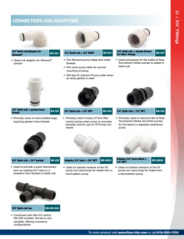 %u2022 Used on barbed versions of the V5 pump-out valve body for intake from a recirculation pump%u2022 Qwik-Lok adaptor for Attwood%u00aepumps%u2022 Used on barbed versions of the V5 pump-out valve body for intake from a recirculation pumpCONNECTORS AND ADAPTORS3/4%u02dd Qwik-Lok Adaptor for Attwood%u00ae MA-034Adaptor, 3/4%u02dd barb %u00d7 3/4%u02dd NPT MD-00041 Adaptor, 3/4%u02dd barb elbow %u00d7 3/4%u02dd NPT MD-00042%u2022 Fits Attwood pump intake and outlet threads%u2022 Fits most pump inlets for remote mounting of pump%u2022 Will also fit Johnson Pump outlet when an extra gasket is used3/4%u02dd Qwik-Lok %u00d7 3/4%u02dd NSPF MA-021%u2022 Primarily used on some ballast bags requiring garden hose threads3/4%u02dd Qwik-Lok %u00d7 garden hose thread MA-031%u2022 Primarily used in body of Flow-Rite control valves when pump is mounted remotely and for use on V5 Pump-out valves3/4%u02dd Qwik-Lok %u00d7 3/4%u02dd NPT MA-029%u2022 Primarily used on second inlet of Rule Tournament Series and other pumps for the feed to a separate washdown pump3/4%u02dd Qwik-Lok %u00d7 1/2%u02dd NPT MA-035%u2022 Used to provide a quick disconnect from an existing 3/4%u02dd hose or a transition from barbed to Qwik-Lok3/4%u02dd Qwik-Lok %u00d7 3/4%u02dd barbed MA-032%u2022 Used exclusively for the outlet of Rule Tournament Series pumps to adapt to Qwik-Lok3/4%u02dd Qwik-Lok %u00d7 female thread for Rule%u00ae Pumps MA-037%u2022 Combined with MA-014 and/or MA-025 sockets, the tee is very versatile, offering numerous configurations3/4%u02dd Qwik-Lok tee MA-026-QLB11 %u2022 3/4%u02dd FittingsTo order product visit www.flow-rite.com or call 616-583-1700