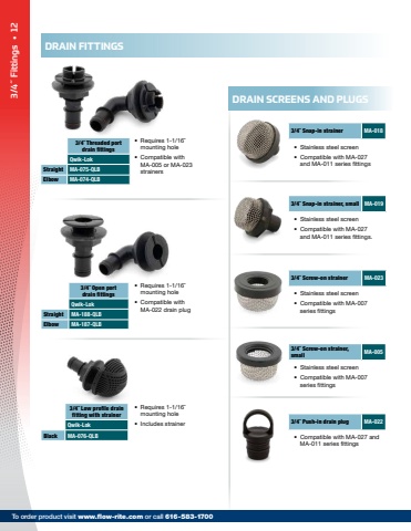 %u2022 Requires 1-1/16%u02dd mounting hole%u2022 Includes strainer%u2022 Requires 1-1/16%u02dd mounting hole%u2022 Compatible with MA-022 drain plug%u2022 Requires 1-1/16%u02dd mounting hole%u2022 Compatible with MA-005 or MA-023 strainers%u2022 Stainless steel screen%u2022 Compatible with MA-027 and MA-011 series fittings.%u2022 Stainless steel screen%u2022 Compatible with MA-027 and MA-011 series fittings%u2022 Compatible with MA-027 and MA-011 series fittings%u2022 Stainless steel screen%u2022 Compatible with MA-007 series fittings%u2022 Stainless steel screen%u2022 Compatible with MA-007 series fittingsDRAIN FITTINGS3/4%u02dd Threaded port drain fittingsQwik-LokStraight MA-075-QLBElbow MA-074-QLB3/4%u02dd Open port drain fittingsQwik-LokStraight MA-188-QLBElbow MA-187-QLB3/4%u02dd Low profile drain fitting with strainerQwik-LokBlack MA-076-QLB3/4%u02dd Push-in drain plug MA-0223/4%u02dd Screw-on strainer, small MA-0053/4%u02dd Screw-on strainer MA-0233/4%u02dd Snap-in strainer, small MA-0193/4%u02dd Snap-in strainer MA-018DRAIN SCREENS AND PLUGS12 3/4%u02dd Fittings %u2022To order product visit www.flow-rite.com or call 616-583-1700