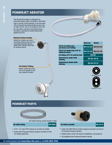FLOW-RITEPower-Jet Air IntakePower-Jet Air IntakeFLOW-RITEMD-DCL-016-W MD-DCL-017-W Qwik-Lok BarbedPJA w/ air intake assy (no decal, no air tubing) MH-PJA-200 MH-PJA-100PJA w/ air intake assy & 20%u02dd air tubing (no decal) MH-PJA-220 MH-PJA-120Air tubing, 3/16%u02dd I.D. (sold by foot) MD-055Domed decal, single white lettering MD-DCL-016-WDomed decal, double white lettering MD-DCL-017-WPOWERJET AERATORThe PowerJet aerator is designed to promote proper water circulation. Mounted near a corner of the livewell, it can be used with a livewell mounted aerator pump only or with our V2, V3, or V4 systems. (It is not for use with a transom mounted pump.) Includes a special air intake fitting with gasket and nut.%u2022 Used with MD-055 air-intake tubing to provide remote air to PowerJet Venturi aerator%u2022 Intake hole is 3/16%u02dd hex key for installation convenience%u2022 Compatible with PowerJet aerator decals %u2022 3/16 I.D. clear PVC tubing for remote air-intake%u2022 Used with PowerJet Venturi aerator and MA-012-B air-intake assemblyAir-intake tubing, (order length in feet)Air-intake tubing MD-00055POWERJET PARTSAir Intake TubingEasily routed and may be cut to length to suit your specific needs.Remote Venturi IntakeVenturi air intake has many mounting options and can be mounted anywhere above water level. Shown here with an optional decal.Air-intake assembly MA-012-B16 Aerators %u2022To order product visit www.flow-rite.com or call 616-583-1700