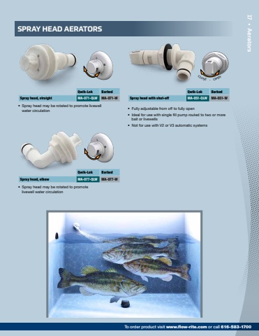 %u2022 Spray head may be rotated to promote livewell water circulation %u2022 Fully adjustable from off to fully open%u2022 Ideal for use with single fill pump routed to two or more bait or livewells%u2022 Not for use with V2 or V3 automatic systemsCLOSE - OPENQwik-Lok BarbedSpray head, straight MA-071-QLW MA-071-WQwik-Lok BarbedSpray head, elbow MA-077-QLW MA-077-WQwik-Lok BarbedSpray head with shut-off MA-051-QLW MA-051-WSPRAY HEAD AERATORS%u2022 Spray head may be rotated to promote livewell water circulation17 %u2022 AeratorsTo order product visit www.flow-rite.com or call 616-583-1700