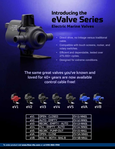 The same great valves you've known and loved for 40+ years are now available control cable free!eV1 OPEN - CLOSED EV-11-NN01eV2 AUTO - EMPTY EV-12-NN01eV3 RECIRC - EMPTY - AUTO EV-13-NN01eV4 FILL - EMPTY - AUTO EV-14-NN01eV5 RECIRC - PUMP-OUT EV-15-NN11eVA OPEN - CLOSE EV-5A-NN01eVB BAG A - BOTH - BAG B EV-5B-NN11eV1 eV2 eV3 eV4 eV5 eVA eVB%u2022 Direct drive, no linkage versus traditional cable.%u2022 Compatible with touch screens, rocker, and rotary switches.%u2022 Efficient and dependable, tested over 275,000+ cycles.%u2022 Designed for extreme conditions.Introducing the eValve SeriesElectric Marine ValvesTo order product visit www.flow-rite.com or call 616-583-1700