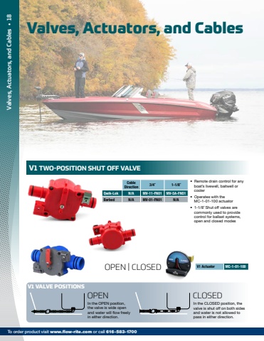 OPEN | CLOSED%u2022 Remote drain control for any boat%u2019s livewell, baitwell or cooler%u2022 Operates with the MC-1-01-100 actuator%u2022 1-1/8%u02dd Shut off valves are commonly used to provide control for ballast systems, open and closed modesValves, Actuators, and CablesCable Direction 3/4%u02dd 1-1/8%u02ddQwik-Lok N/A MV-11-FN01 MV-5A-FNO1Barbed N/A MV-01-FN01 N/AV1 Actuator MC-1-01-100V1 TWO-POSITION SHUT OFF VALVE In the OPEN position, the valve is wide open and water will flow freely in either direction.In the CLOSED position, the valve is shut off on both sides and water is not allowed to pass in either direction.V1 VALVE POSITIONSOPEN CLOSED18 Valves, Actuators, and Cables %u2022To order product visit www.flow-rite.com or call 616-583-1700