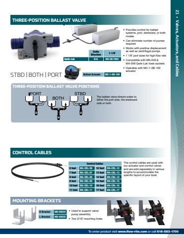 The control cables are used with our actuator and control valves and are sold separately in various lengths to accommodate the specific layout of your boat.Control Cables6 foot MA-CBL-06 12 foot MA-CBL-127 foot MA-CBL-07 13 foot MA-CBL-138 foot MA-CBL-08 14 foot MA-CBL-149 foot MA-CBL-09 15 foot MA-CBL-1510 foot MA-CBL-10 16 foot MA-CBL-1611 foot MA-CBL-11 17 foot MA-CBL-17%u2022 Used to support valve/pump assembly%u2022 Two 3/16%u02dd mounting holes U-Bracket MD-00034L-Bracket MD-00035Ballast Actuator MC-1-0B-100Cable Direction 1-1/8%u02ddQwik-Lok N/A MV-5B-FN01STBD | BOTH | PORT%u2022 Provides control for ballast systems, port, starboard, or both modes%u2022 Can eliminate number of pumps required%u2022 Works with positive displacement as well as centrifugal pumps%u2022 1 1/8%u02dd port sizes for high flow rate%u2022 Compatible with MA-040 & MA-049 Qwik-Lok hose sockets%u2022 Operates with MC-1-0B-100 actuatorTHREE-POSITION BALLAST VALVECONTROL CABLESMOUNTING BRACKETSTHREE-POSITION BALLAST VALVE POSITIONSThe ballast valve directs water to either the port side, the starboard side or both.PORTBOTHSTBD21 %u2022 Valves, Actuators, and CablesTo order product visit www.flow-rite.com or call 616-583-1700