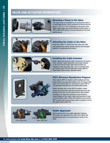 Cable ApproachSome valves have two cable approach options. The cable can approach the valve from either the front/livewell side or the rear/transom side of the boat.VALVE AND ACTUATOR INFORMATIONFront Approach Rear ApproachInstalling the Cable ActuatorInsert cable wire through hole in brass arm as shown. Then, position cable assembly into brass bracket U-slot and secure finger tight with knurled nut. Carefully push assembly into 1-3/4%u02dd mounting hole and secure with two P/N MD-093 screws (#6-32, truss head, black oxide, stainless steel).Attaching the Cable to the ValveInsert the cable %u201cZ%u201d bend from the valve cap side and position the clamp directly behind the enlarged section of cable jacket as shown.Mounting a Pump to the ValveThe valve body is threaded for mounting the inlet of a centrifugal pump. Use a hacksaw to remove all but about 1-1/4%u02dd to 1-1/2%u02dd of threads on the pump inlet. Apply Teflon tape and mount directly to the valve. A 700 to 800 GPH pump is recommended for the best performance.P.E.F. (Pressure Equalization Flapper)Only specify PEF for higher profile walleye and bay boats where the livewell overflow is 8%u02dd%u201312%u02dd above lake level. If it is more than 12%u02dd, use the V4 valve. PEF is not generally required for low profile bass boats. While off plane and in the AUTO position, water enters the valve from both the livewell drain and the transom thru-hull. As the water level in the livewell increases, so does the pressure on the transom check feature of the valve, reducing the ratio of fresh to recirculated water. When this pressure is too great, PEF insures that enough fresh water is added to force the upper used water out.22 Valves, Actuators, and Cables %u2022To order product visit www.flow-rite.com or call 616-583-1700