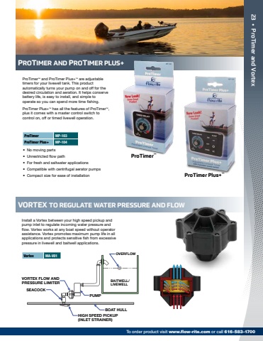 Vortex MA-V01Install a Vortex between your high speed pickup and pump inlet to regulate incoming water pressure and flow. Vortex works at any boat speed without operator assistance. Vortex promotes maximum pump life in all applications and protects sensitive fish from excessive pressure in livewell and baitwell applications. %u2022 No moving parts %u2022 Unrestricted flow path %u2022 For fresh and saltwater applications %u2022 Compatible with centrifugal aerator pumps %u2022 Compact size for ease of installation ProTimer%u2122 and ProTimer Plus+%u2122 are adjustable timers for your livewell tank. This product automatically turns your pump on and off for the desired circulation and aeration. It helps conserve battery life, is easy to install, and simple to operate so you can spend more time fishing.ProTimer Plus+%u2122 has all the features of ProTimer%u2122, plus it comes with a master control switch to control on, off or timed livewell operation.ProTimer MP-103ProTimer Plus+ MP-104VORTEX TO REGULATE WATER PRESSURE AND FLOWPROTIMER AND PROTIMER PLUS+ProTimer%u2122ProTimer Plus+%u2122VORTEX FLOW AND PRESSURE LIMITER SEACOCKPUMPHIGH SPEED PICKUP (INLET STRAINER)BOAT HULLBAITWELL/LIVEWELLOVERFLOW23 %u2022 ProTimer and VortexTo order product visit www.flow-rite.com or call 616-583-1700