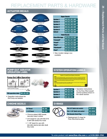 REPLACEMENT PARTS & HARDWARE%u2022 Operation instructions for the Pump-out aeratorSystem 3%u201cFRONT%u201d%u201cFlow-Rite%u201d%u201cSTARBOARD%u201d%u201cREAR%u201d%u201cLIVEWELL%u201d%u201cPORT%u201dSystem 5 BallastSystem 4System 1 System 2Flow-Rite Controls, Ltd. 960 74th Street SW, Byron Center, MI 49315 (616) 583-1700 www.flow-rite.comSYSTEM2Turn off the pump and place the actuator in the EMPTY position to drain the livewell. This position allowswater to drain and prevents water from entering the livewell.EMPTYThis is the primary operating position, used to fill and maintain a full livewell. This position automaticallyblends fresh water with recirculated water while off-plane and forces used, contaminated water out theoverflow. The AUTO position automatically closes the drain to prevent water loss when the pump is off or the boat is on-plane and allows the pump to recirculate. Any water lost through the overflow while the boat is on-plane will automatically be replenished when off-plane. AUTOSystem 2 Livewell Control System Instructions%u2022 Operation instructions for the Flow-Rite livewell control systems shown in the valves section%u2022 New modern design now available ACTUATOR DECALSPUMP-OUT AERATOR SYSTEM OPERATION LABELSOPERATION LABELPOA operation label MD-LBL-004Upper DecalsSystem 1 MD-DCL-001-WHTSystem 2 MD-DCL-002-WHTSystem 3 MD-DCL-003-WHTSystem 4 MD-DCL-004-WHTSystem 5 MD-DCL-005-WHTBallast MD-DCL-026-WHTKnob DecalsFlow-Rite logo MD-DCL-010-WHT%u201cLivewell%u201d MD-DCL-011-WHT%u201cFront%u201d MD-DCL-012-WHT%u201cRear%u201d MD-DCL-013-WHT%u201cStarboard%u201d MD-DCL-014-WHT%u201cPort%u201d MD-DCL-015-WHTSystem 1 MD-LBL-012System 2 MD-LBL-013System 3 MD-LBL-014System 4 MD-LBL-015CHROME BEZELS O-RINGS%u2022 Chrome plated ABS bezels securely snap in place%u2022 3/4%u02dd bezel for use with MA-016 & MA-028 series thru-hulls%u2022 1-1/8%u02dd bezel for use with MA-063-QLB & MA-064-QLB thru-hulls3/4%u02dd Bezel MA-0651-1/8%u02dd Bezel MA-066%u2022 Replacement O-rings for Flow-Rite Marine partsFits 3/4%u02dd Qwik-Lok socket MD-00014Fits 1-1/8%u02dd Qwik-Lok socket MD-00066Fits Remote Drain Plug MD-0020225 %u2022 Replacement Parts and HardwareTo order product visit www.flow-rite.com or call 616-583-1700