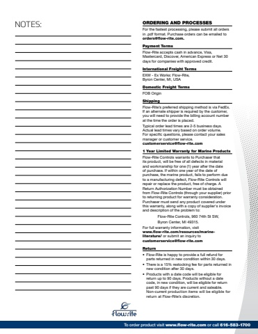 REPLACEMENT PARTS & HARDWAREA. Small O-ringB. Button flapper - 2 qty.C. Flapper - 2 qty.D. 6 x 5/16 sheet metal screwE. ArmF. 6 x 1/2 sheet metal screwG. LinkH. #6 x 1/2 machine screwI. ClampJ. #6-32 nut w/ insertK. Large O-ringNOTES: ORDERING AND PROCESSESFor the fastest processing, please submit all orders in .pdf format. Purchase orders can be emailed toorders@flow-rite.com.Payment TermsFlow-Rite accepts cash in advance, Visa, Mastercard, Discover, American Express or Net 30 days for companies with approved credit. International Freight TermsEXW - Ex Works: Flow-Rite, Byron Center, MI, USADomestic Freight TermsFOB OriginShippingFlow-Rite%u2019s preferred shipping method is via FedEx. If an alternate shipper is required by the customer, you will need to provide the billing account number at the time the order is placed.Typical order lead times are 2-5 business days. Actual lead times vary based on order volume. For specific questions, please contact your sales manager or customer service. customerservice@flow-rite.com1 Year Limited Warranty for Marine ProductsFlow-Rite Controls warrants to Purchaser that its product, will be free of all defects in material and workmanship for one (1) year after the date of purchase. If within one year of the date of purchase, the marine product, fails to perform due to a manufacturing defect, Flow-Rite Controls will repair or replace the product, free of charge. A Return Authorization Number must be obtained from Flow-Rite Controls (through your supplier) prior to returning product for warranty consideration. Purchaser must send any product covered under this warranty, along with a copy of supplier's invoice and description of the problem to:Flow-Rite Controls, 960 74th St SW,Byron Center, MI 49315.For full warranty information, visitwww.flow-rite.com/resources/marineliterature/ or submit an inquiry tocustomerservice@flow-rite.comReturn %u2022 Flow-Rite is happy to provide a full refund for parts returned in new condition within 30 days.%u2022 There is a 15% restocking fee for parts returned in new condition after 30 days.%u2022 Products with a date code will be eligible for return up to 90 days. Products without a date code, in new condition, will be eligible for return past 90 days if they are current and saleable. Non-current production items will be eligible for return at Flow-Rite%u2019s discretion. 27 %u2022 Replacement Parts and HardwareTo order product visit www.flow-rite.com or call 616-583-1700