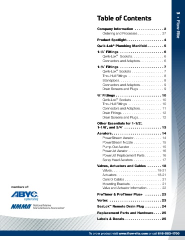3Table of ContentsCompany Information . . . . . . . . . . . . . 2Ordering and Processes . . . . . . . . . . . . . 27Product Spotlight . . . . . . . . . . . . . . . . . 4Qwik-Lok%u00ae Plumbing Manifold . . . . . . . 51-%u00bd%u02dd Fittings . . . . . . . . . . . . . . . . . . . . 6Qwik-Lok%u00ae Sockets . . . . . . . . . . . . . . . . . 6Connectors and Adaptors . . . . . . . . . . . . . 61-%u00b9%u20448%u02dd Fittings . . . . . . . . . . . . . . . . . . . . 7Qwik-Lok%u00ae Sockets . . . . . . . . . . . . . . . . . 7Thru-Hull Fittings . . . . . . . . . . . . . . . . . . . 8Standpipes . . . . . . . . . . . . . . . . . . . . . . . . 8Connectors and Adaptors . . . . . . . . . . . . . 9Drain Screens and Plugs . . . . . . . . . . . . . 9%u00be%u02dd Fittings . . . . . . . . . . . . . . . . . . . . . 10Qwik-Lok%u00ae Sockets . . . . . . . . . . . . . . . . 10Thru-Hull Fittings . . . . . . . . . . . . . . . . . . 10Connectors and Adaptors . . . . . . . . . . . . 11Drain Fittings...................... 12Drain Screens and Plugs............. 12Other Essentials for 1-1/2%u02dd, 1-1/8%u02dd, and 3/4%u02dd . . . . . . . . . . . . . . . . . 13Aerators . . . . . . . . . . . . . . . . . . . . . . . 14PowerStream Aerator . . . . . . . . . . . . . . . 14PowerStream Nozzle . . . . . . . . . . . . . . . 15Pump-Out Aerator . . . . . . . . . . . . . . . . . 15PowerJet Aerator . . . . . . . . . . . . . . . . . . 16PowerJet Replacement Parts . . . . . . . . . 16Spray Head Aerators . . . . . . . . . . . . . . . 17Valves, Actuators and Cables . . . . . . 18Valves . . . . . . . . . . . . . . . . . . . . . . . . 18-21Actuators . . . . . . . . . . . . . . . . . . . . . 18-21Control Cables . . . . . . . . . . . . . . . . . . . . 21Mounting Brackets . . . . . . . . . . . . . . . . . 21Valve and Actuator Information . . . . . . . . 22ProTimer & ProTimer Plus+ . . . . . . . 23Vortex . . . . . . . . . . . . . . . . . . . . . . . . 23SeaLokTM Remote Drain Plug . . . . . . . 24Replacement Parts and Hardware . . . 25Labels & Decals . . . . . . . . . . . . . . . . . 25members of:3 %u2022 Flow-RiteTo order product visit www.flow-rite.com or call 616-583-1700